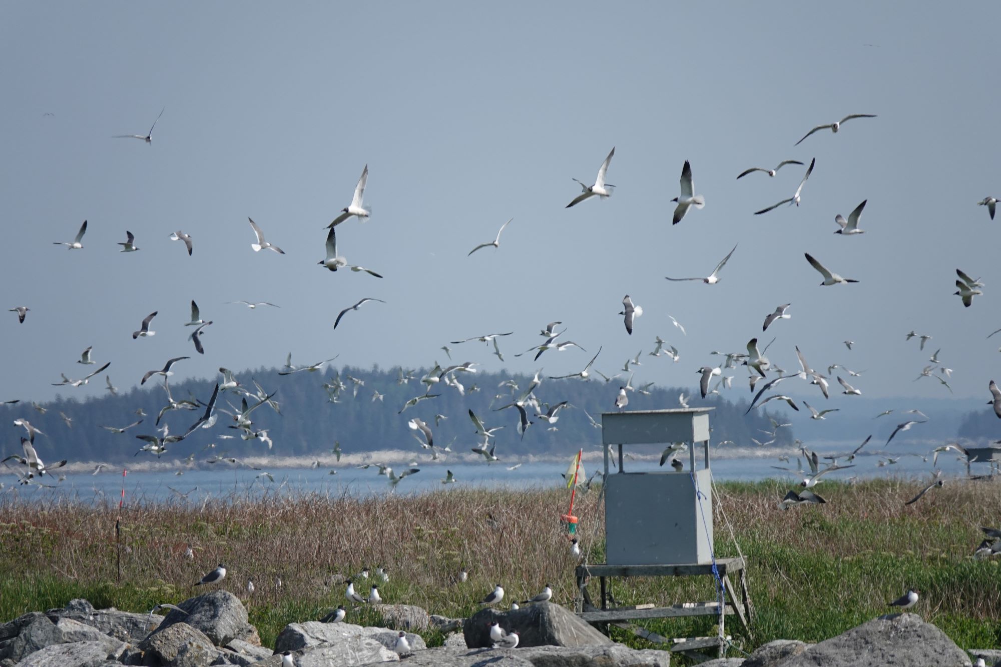 So, it was a bit surprising when our first stop six miles out of the harbor at Eastern Egg Rock had us listening to two Savannah sparrows and one song sparrow. But their calls were mostly drowned out by the cacophony of sound created by an estimated 1000 gulls, mostly the raucous laughing gulls, along with nearly 600 terns, including elusive Arctic and endangered roseate terns. The azure sky over this tiny seven-acre nesting island was constantly alive with the piercing calls of soaring white birds, sometimes joined by smaller numbers of Atlantic puffins, black guillemots, common eiders, and a handful of double-crested cormorants. Our guides managed to sort out a few other species that added to the diversity of our experience: four great black-backed gulls, three spotted sandpipers and a beautiful lone razorbill, hard to spot this time of year. It all made for a feast for our binoculars and cameras, and a wonderful start to the 5-hour long tour.