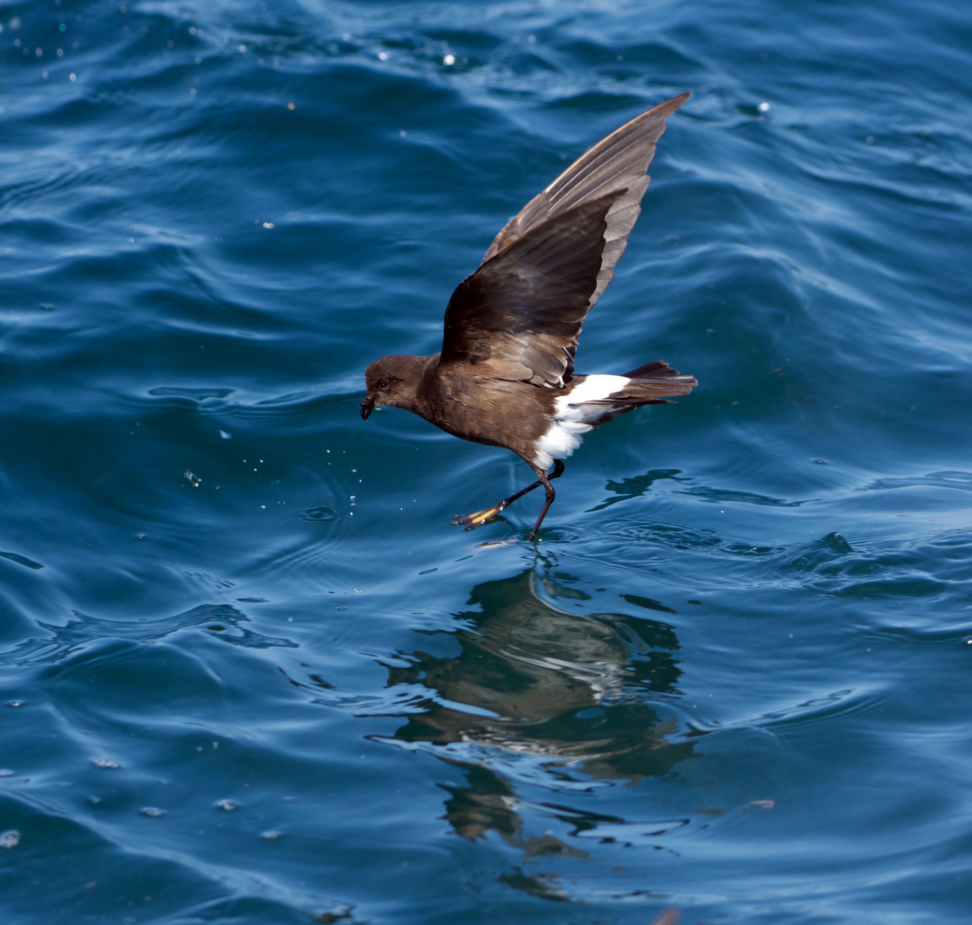 In the deep water the crew began laying what is called a chum line along the surface of the ocean. The idea is to place strong smelling food items in a line one or two miles long in hopes of drawing in offshore birds like shearwaters, jaegers and fulmars, a category of far-ranging birds called the tube noses who have an excellent sense of smell. The chum was mostly chunks of beef fat (like the suet you use for woodpeckers) along with a couple fragrant gallons of herring oil. On this day, the lack of wind worked against us since the smell of the chum line was not well dispersed. While we did not manage to see any of the larger tube-nosed birds mentioned above, we were treated to over 260 Wilson’s storm petrels, beautiful little black and white seabirds that look like they belong in Mackerel Cove, not out in the open ocean.
