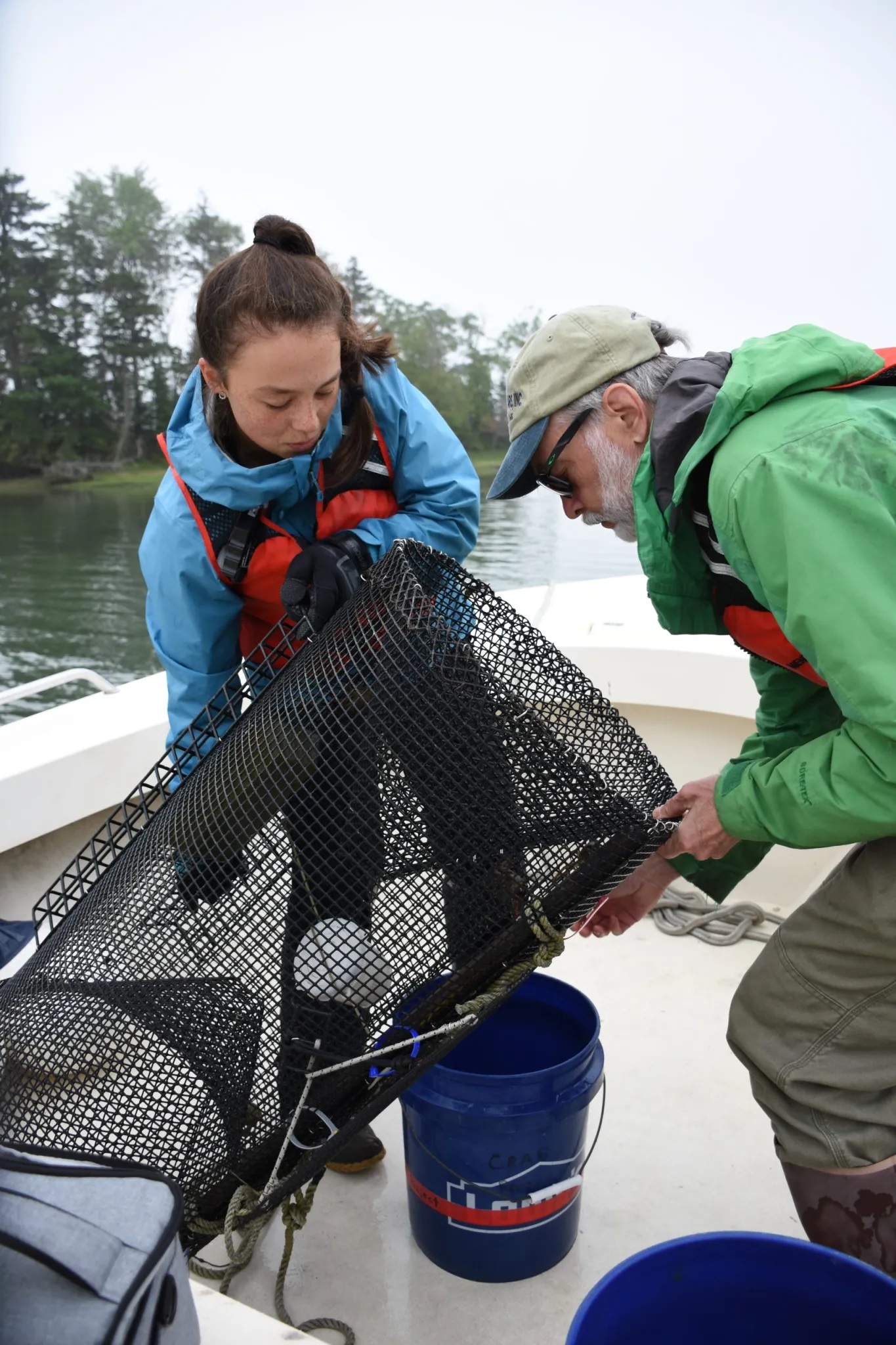 Eva McKone and David Carlon shake crabs out of a wire-mesh trap into a bucket on June 29. McKone, a rising sophomore at Bowdoin, is helping Carlon with his research under a fellowship program at the Schiller Center. (John Gormley photo)
