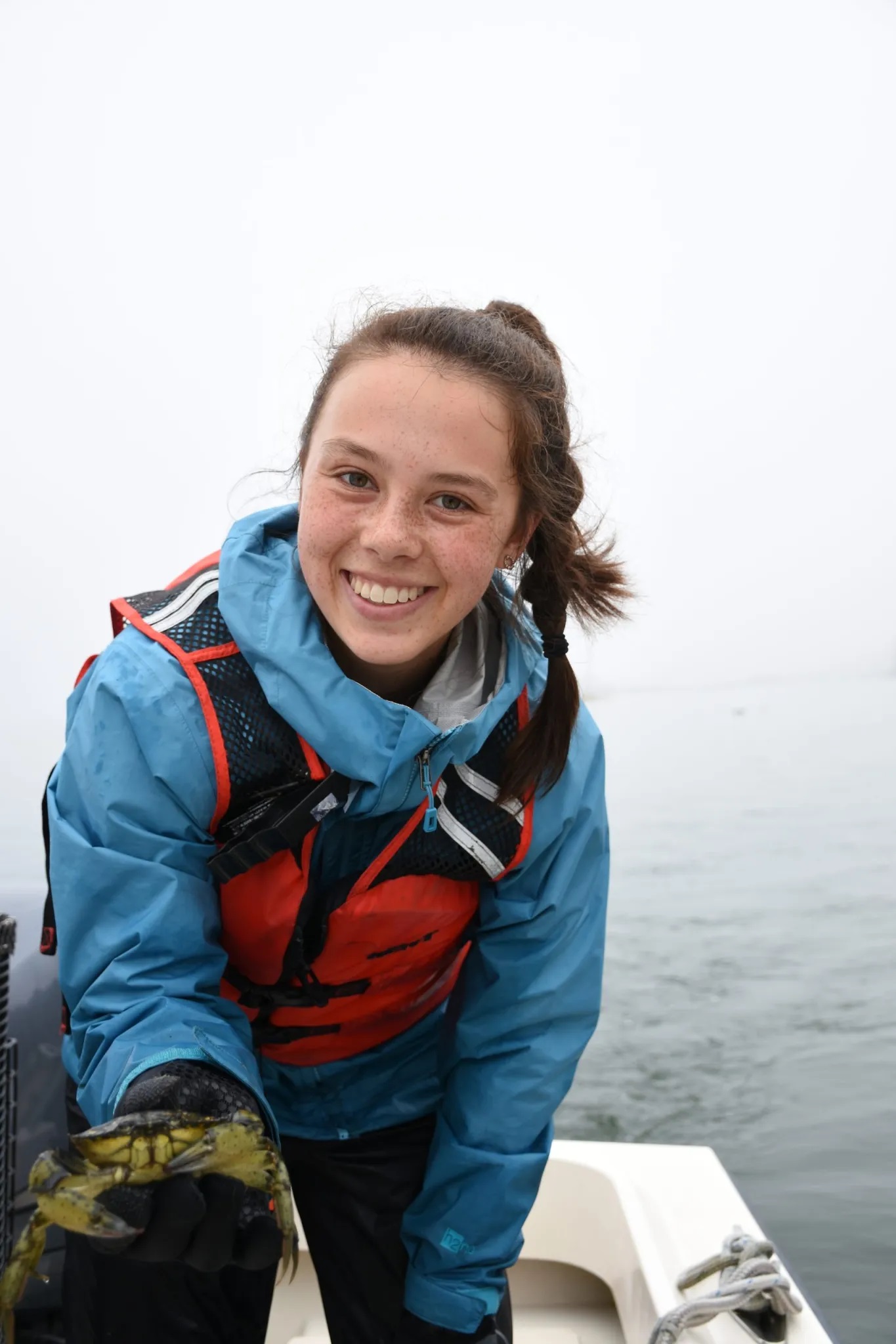 - Eva McKone holds a gaff and prepares to snare a line connected to a crab trap in the water. (John Gormley photo)