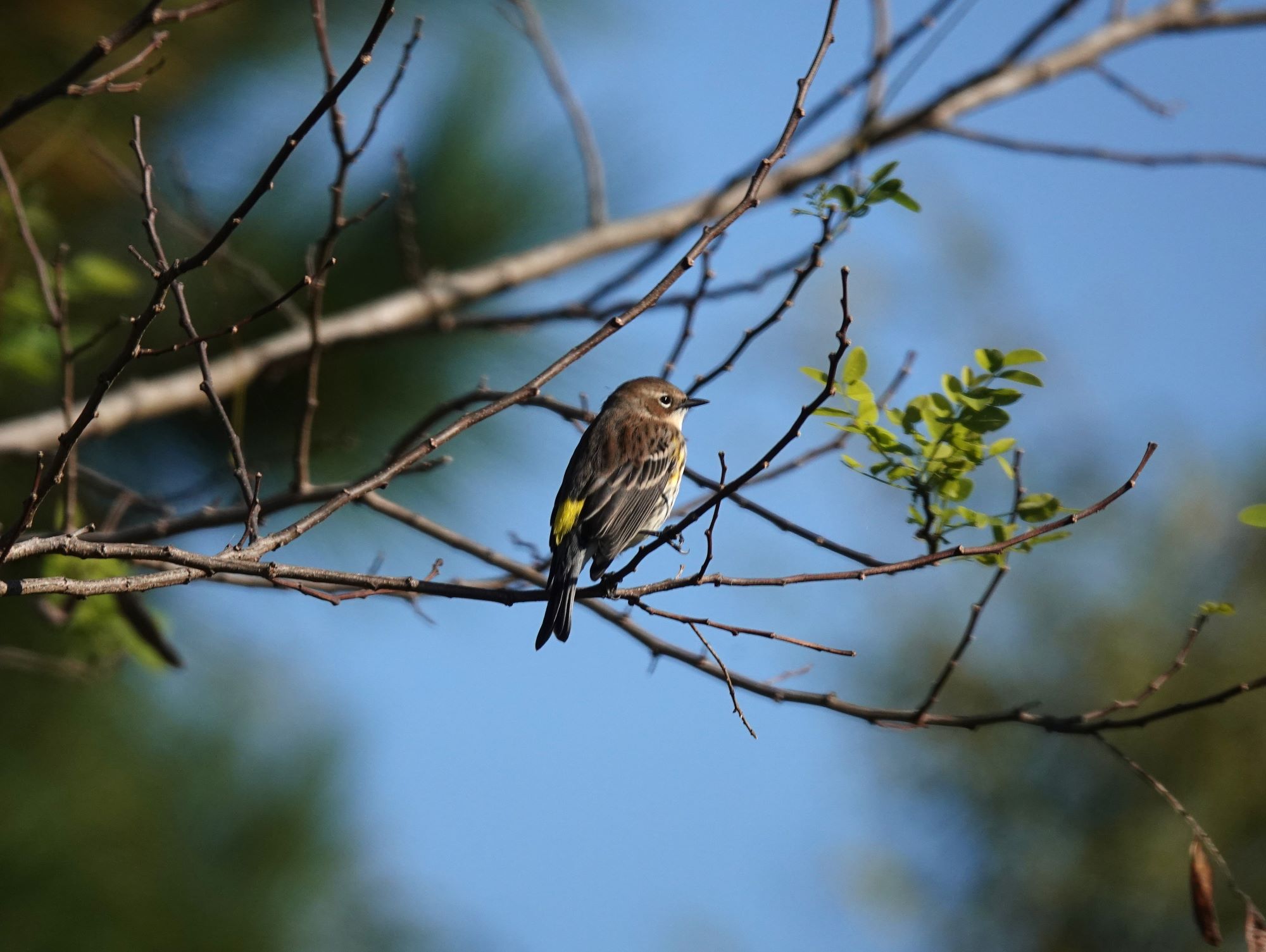 The Merlin app from the Cornell Lab of Ornithology describes the Yellow-rumped Warbler exactly as we encountered the multitudes last week: “in migration and winter, found in any woodland or open shrubby area, including coastal dunes, fields, parks, and residential areas.” As with many other warblers, breeding is generally done in coniferous or mixed forest areas. I enjoy seeing them along Maine’s trout streams, often sitting on an exposed perch such as an alder bush above the water, frequently darting out for a short flight to snatch a tasty insect from the air and returning to their perch. The birds are tolerant of human presence when engaging in this feeding behavior.