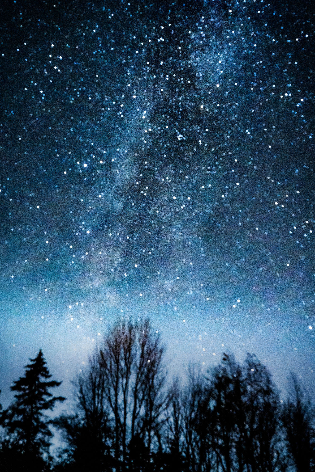 blue sky above pine trees shows stars