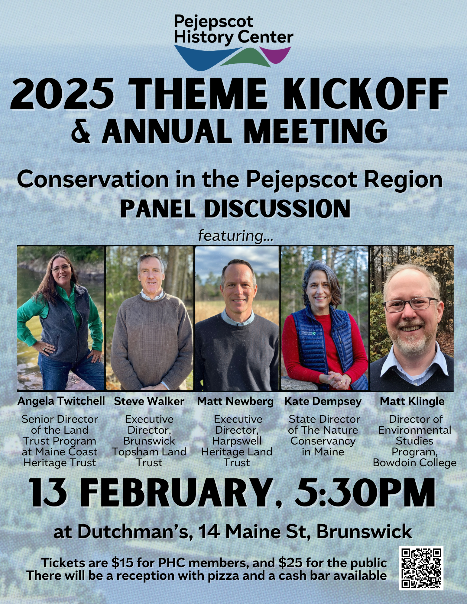 The event takes place on Thursday, February 13, in the community space operated by Dutchman’s in Fort Andross, 14 Maine Street, Brunswick. Festivities begin at 5:30PM with a reception, followed by a short PHC annual meeting and announcement of the 2024 Richard O. Thompson Volunteer Award honoree. The panel begins at approximately 6:30PM.